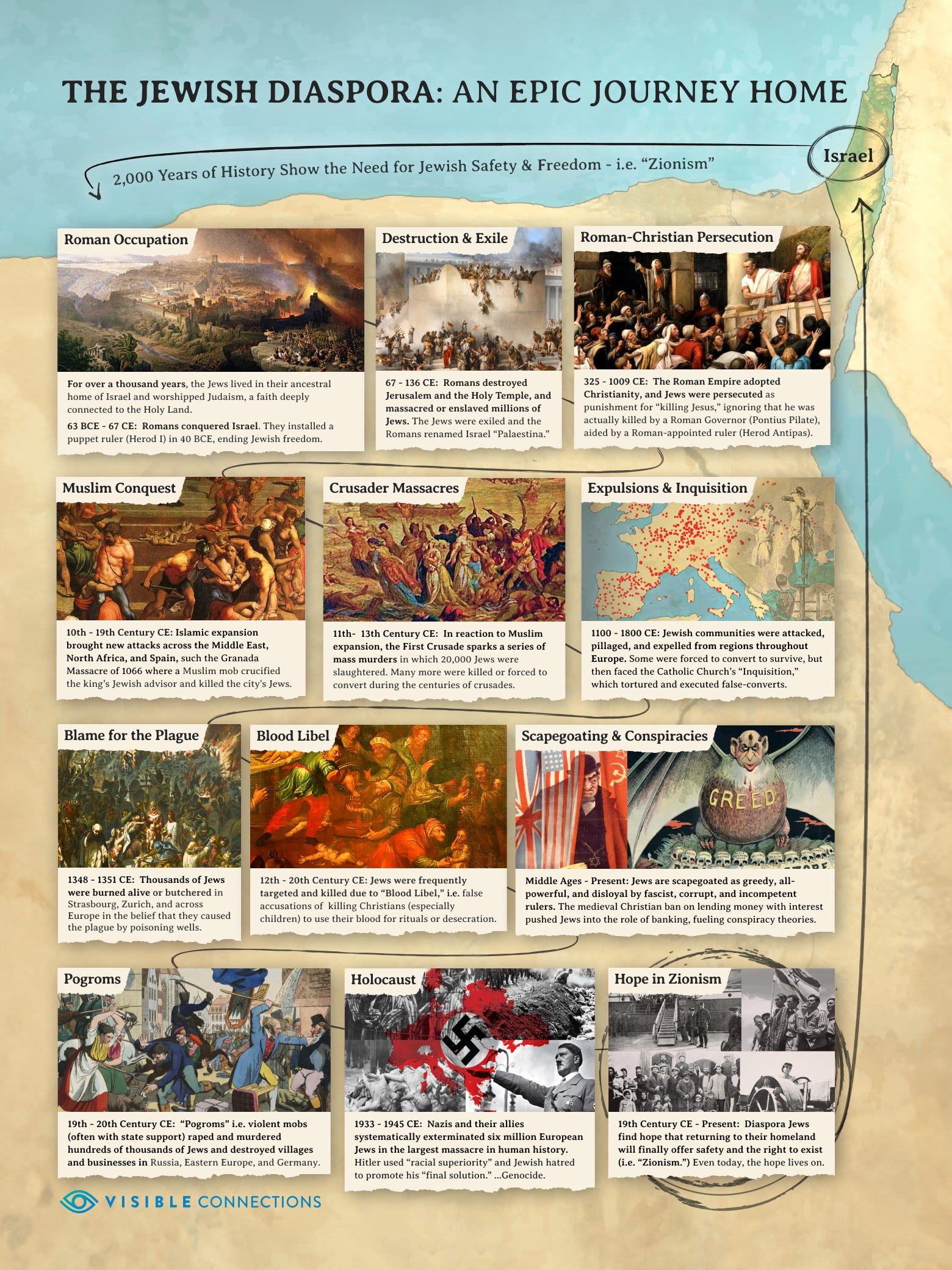 This Visible Connections timeline distills 2,000 years of painful Jewish history, illustrating the need for safety and freedom in their ancient homeland - i.e. “Zionism."